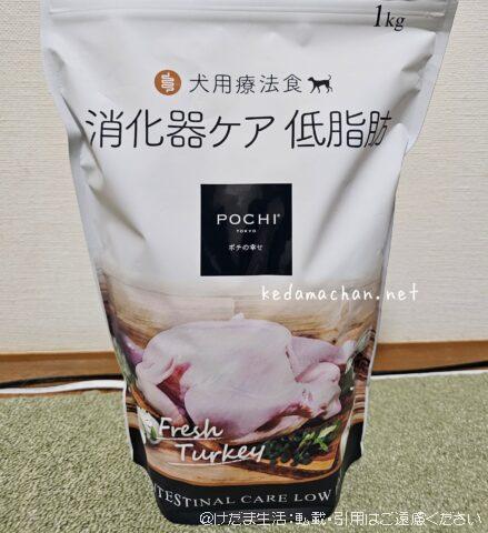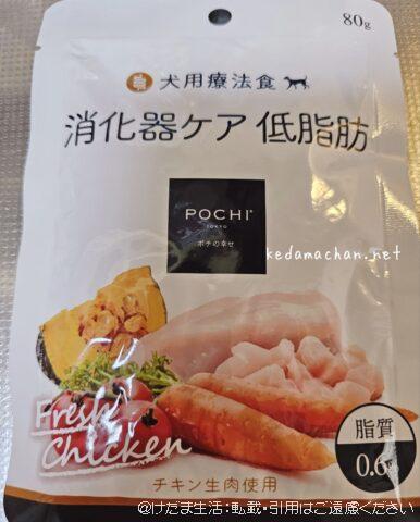 まずは市販の総合栄養食レベルで低脂肪のものを試しておきたいと思い、つるちゃんが苦手な原材料がなるべく入っていないものを探した結果、「POCHI消化器ケア 低脂肪」を試すことに決めた。